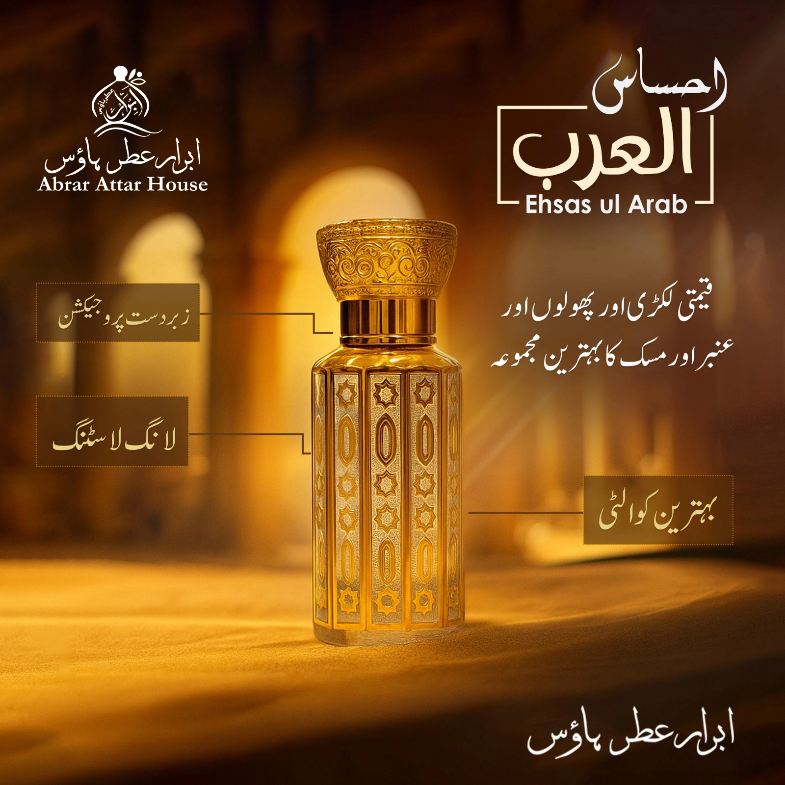 Ehsas Al Arab is a premium, alcohol-free Arabic attar with a rich, warm, and long-lasting aroma. Crafted for men who appreciate traditional oriental elegance, it delivers confidence, depth, and a classy presence for daily and special occasions.